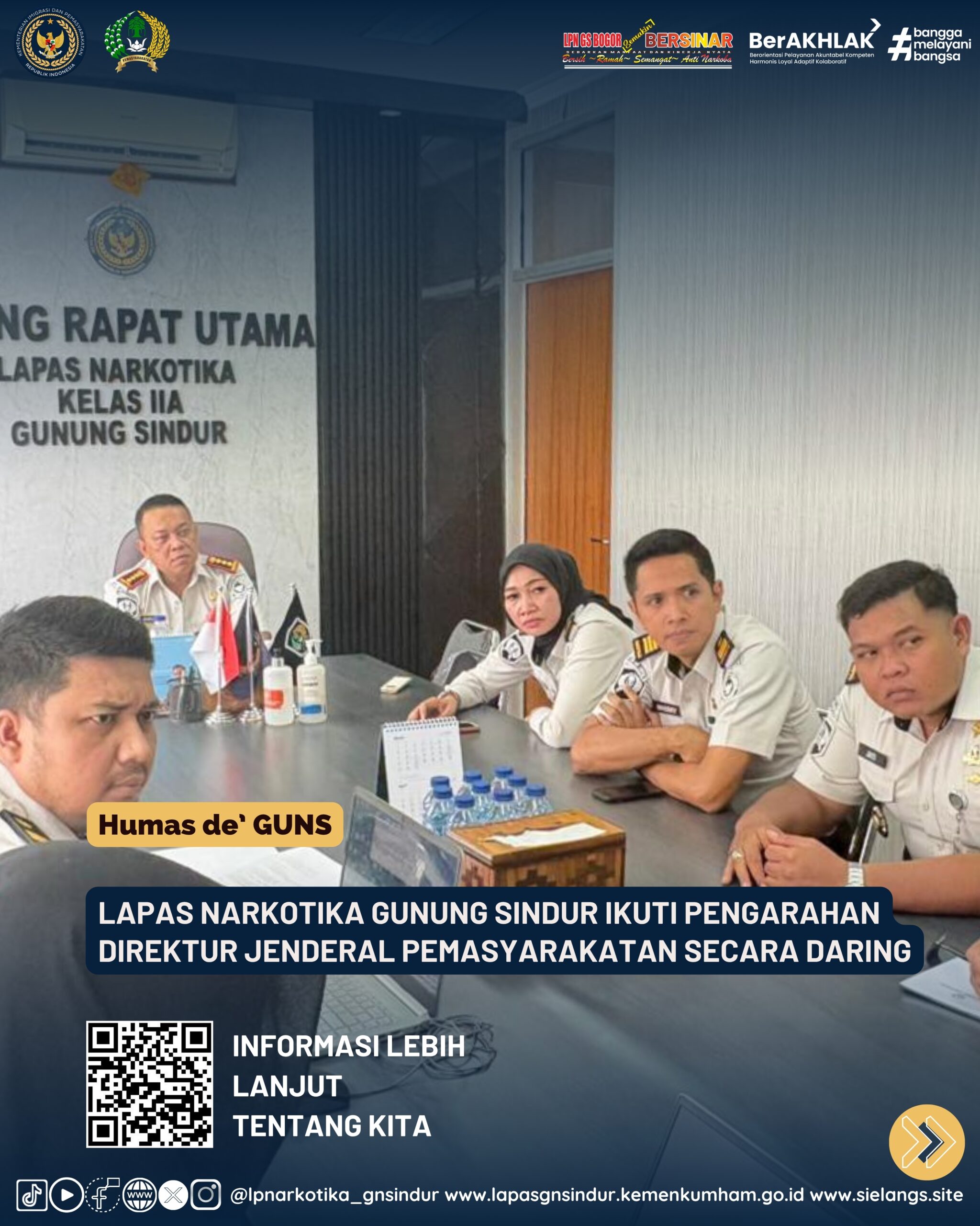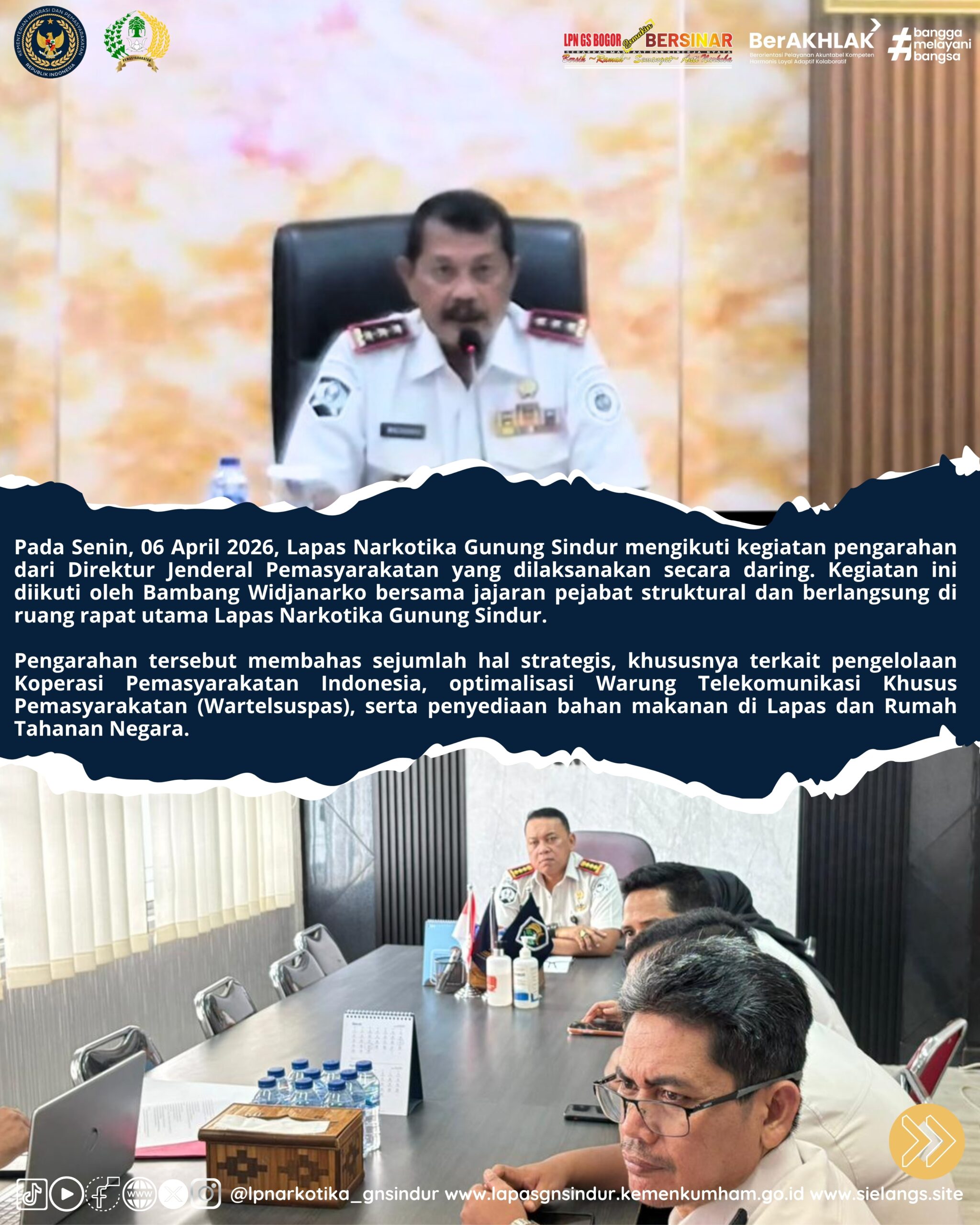 Pada Senin, 06 April 2026, Lapas Narkotika Gunung Sindur mengikuti kegiatan pengarahan dari Direktur Jenderal Pemasyarakatan yang dilaksanakan secara daring. Kegiatan ini diikuti oleh Bambang Widjanarko bersama jajaran pejabat struktural dan berlangsung di ruang rapat utama Lapas Narkotika Gunung Sindur.